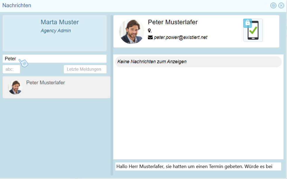 Um anderen Kunden eine Chatnachricht zu senden, einfach den Namen des Kunden im Suchfeld innerhalb des Chats eintragen und wie vorher die Nachricht in das Sendefeld eingeben.