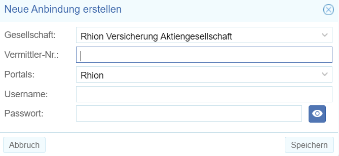 2. Durch Aktiveren des Felds "Neue Anbindung" öffnet sich das Fenster, in das Sie Ihre Vermittlernummer und Extranet Zugangsdaten ergänzen können