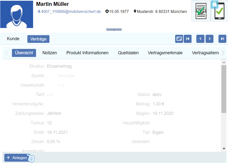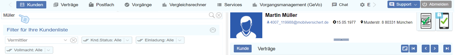 3. Unter dem Kunden Martin Müller wählen Sie "Vertrag" aus
