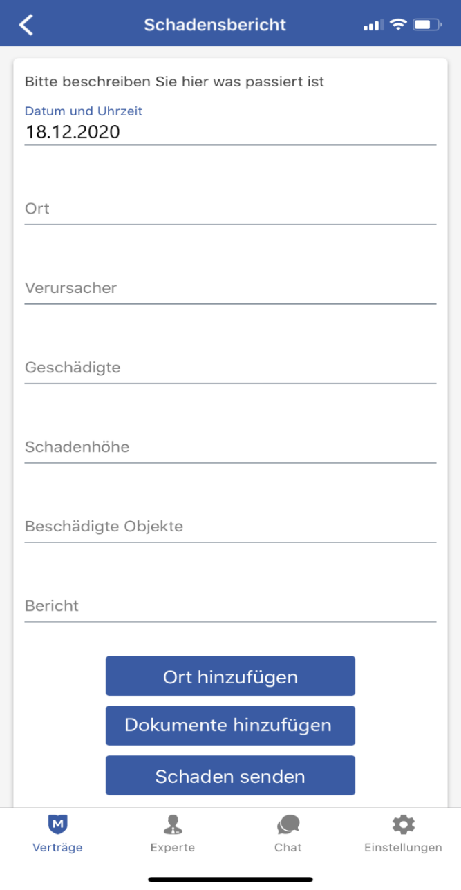 Hier bitte die Angaben zum Schaden ergänzen. Das Datum ist voreingestellt, kann aber variabel angepasst werden. Der Ort kann eingegeben oder über die Standortabfrage hinzugefügt werden. Über „Dokumente hinzufügen“ können außerdem Bilder und weitere Dokumente wie z. B. Rechnungen angehängt werden.