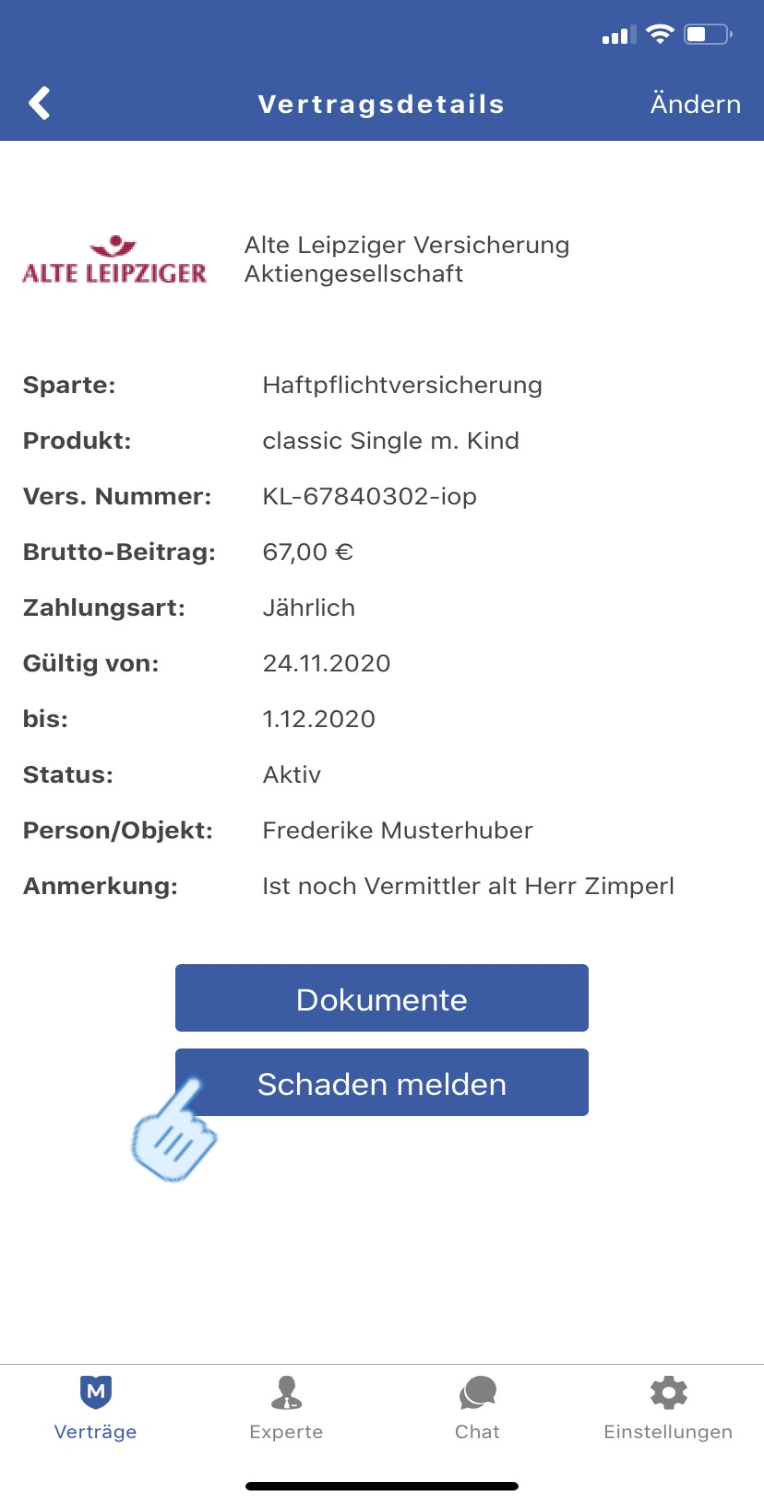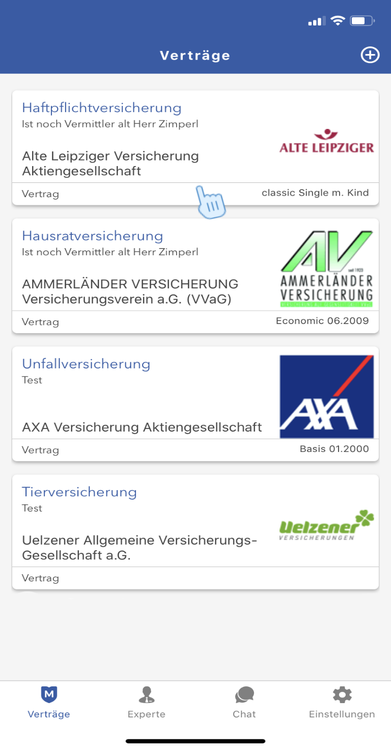 Unter „Verträge“ wählen Sie bitte den passenden Versicherungsvertrag aus.