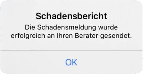 Der Vorgang ist abgeschlossen und der Schaden ist Ihrem Versicherungsmakler übermittelt worden, wenn Sie diese Meldung bekommen. Mit „OK“ bestätigen