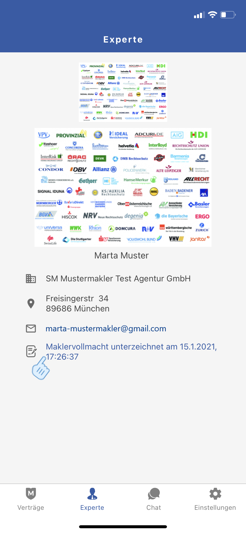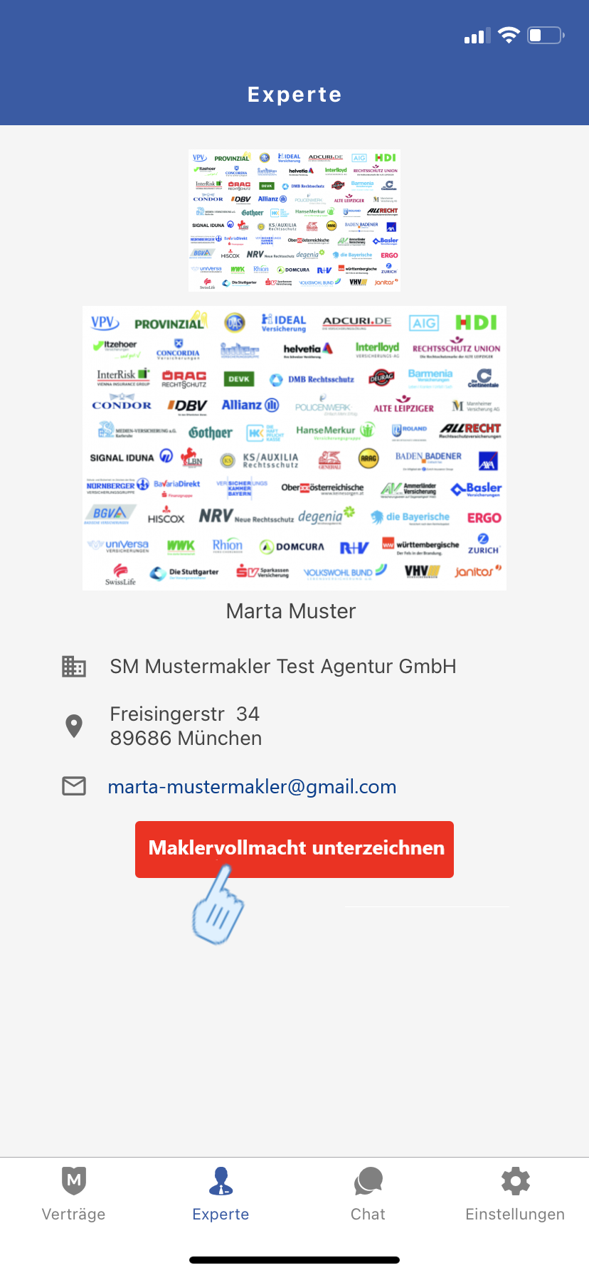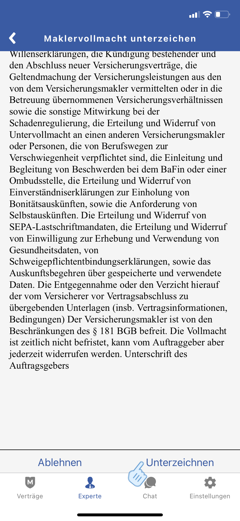 Die Maklervollmacht ist eine wichtige Arbeitsgrundlage für Ihren Versicherungsmakler, damit kann er Sie und Ihre Interessen in vollem Umfang bei den Versicherungsunternehmen vertreten. Die Maklervollmacht können Sie komplett digital an Ihren Versicherungsmakler weiterleiten. Dazu brauchen Sie nur einen App-Zugang. Über diesen Zugang kann Ihnen Ihr Versicherungsmakler dieses Dokument zur Unterschrift senden und Sie können es im Anschluss mit Ihrem Finger unterzeichnen. Wie genau, das sehen Sie hier.