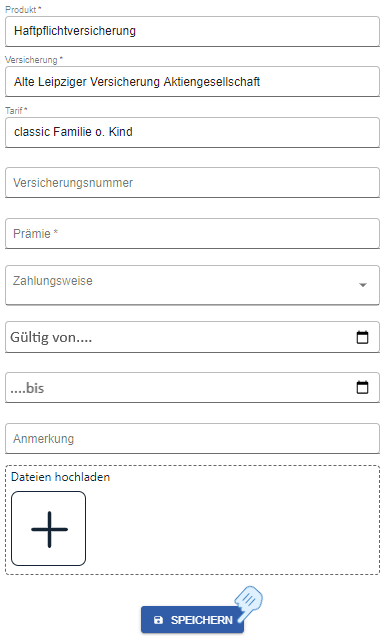 Die Versicherungsschein Nr., die Prämie, die Zahlweise, von wann bis wann der Vertrag gültig ist und weitere Anmerkungen werden hier ergänzt. Es können bei Bedarf auch Dokumente zum Vertrag hochgeladen werden.
