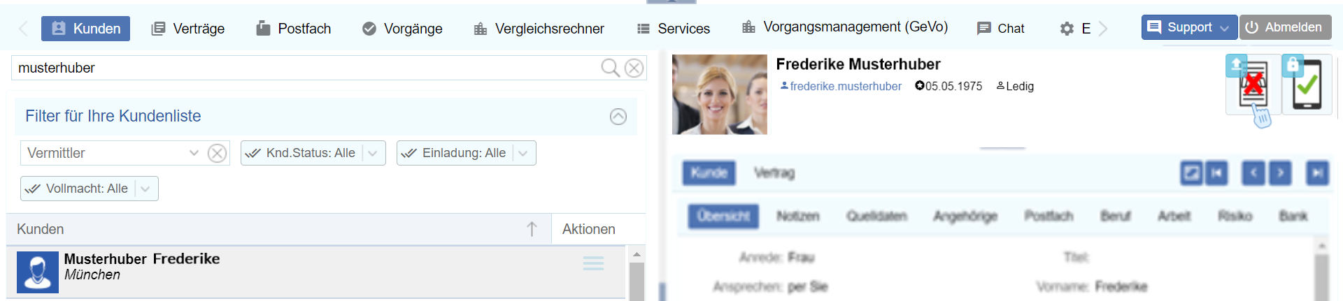 Über das Symbol mit dem roten Kreuz können Sie sehen, dass hier noch keine Maklervollmacht vorliegt.