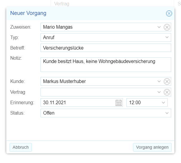 Wenn Sie einen Kunden zu einem späteren Zeitpunkt kontaktieren wollen oder noch einen Vertrag senden müssen, können Sie sich über Vorgänge eine Erinnerung erstellen.