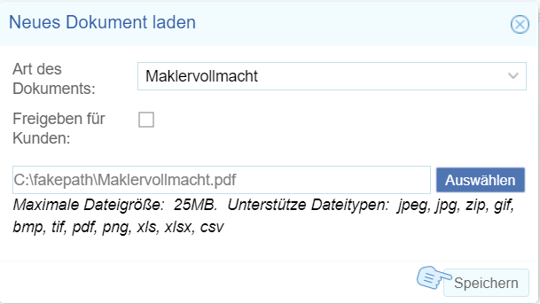 In diesem Fenster ist die Maklervollmacht vorausgewählt. Hier über "Auswählen" öffnet sich ein weiteres Upload-Fenster. Dort kann die Datei in Ihrem Computer ausgewählt werden.