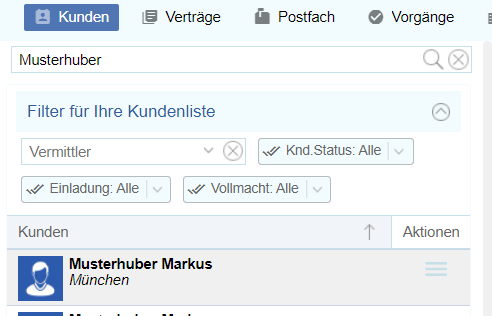Um den Kunden, für den Sie die Maklervollmacht hochladen möchten, schnell zu finden, geben Sie den Kundennamen in die Suchleiste ein.
