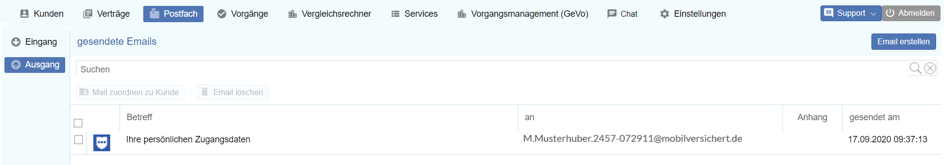 Dazu klicken Sie auf Postfach und wählen dort den Postausgang aus. Wie Sie hier sehen, sind die persönlichen Zugangsdaten an den Kunden verschickt worden.
